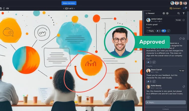 Reviewers can also collaborate within the platform to provide comments and mark up specific problem areas with precise and actionable feedback. This cuts down on miscommunication, time loss, and even rework due to missed feedback.